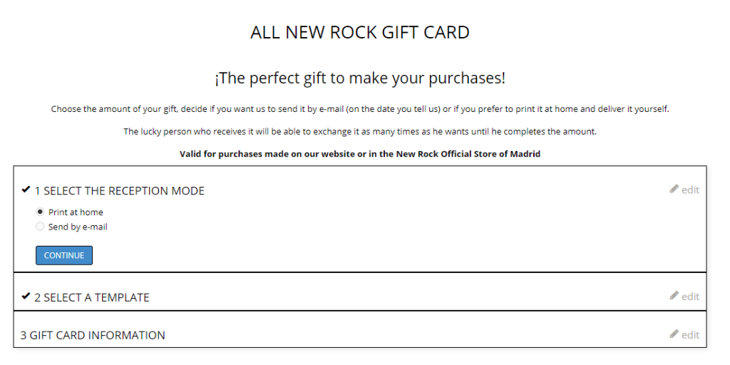 And finally you can CUSTOMIZE YOUR CARD !! ,write your message, be original, it’s your voice. Only 200 words. In this section you can choose the money of the present, between $ 50 and $ 300. If you have followed these steps, you will have created a different and special gift. With the New Rock guarantee, synonymous with quality and prestige.
