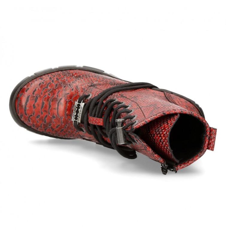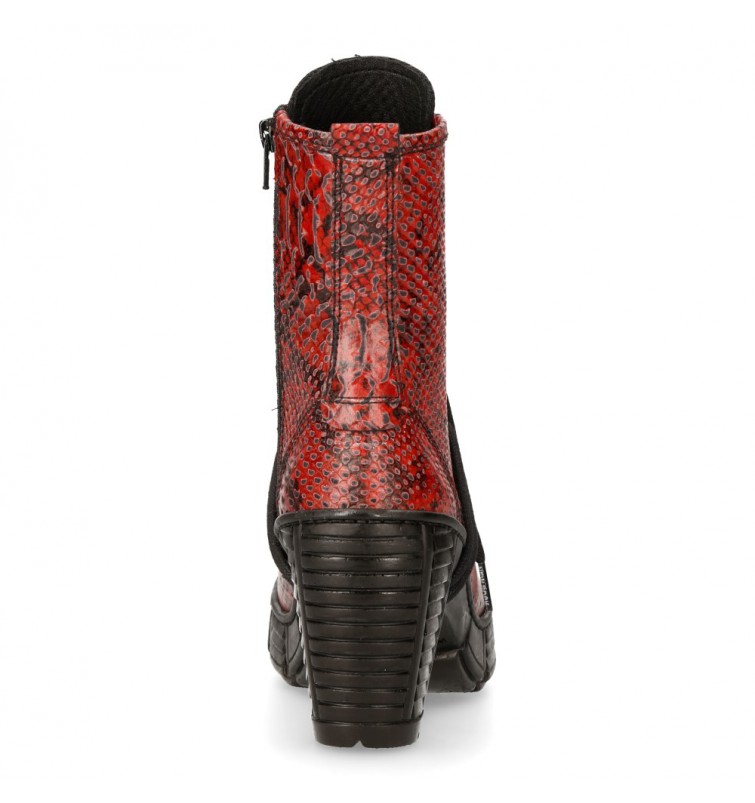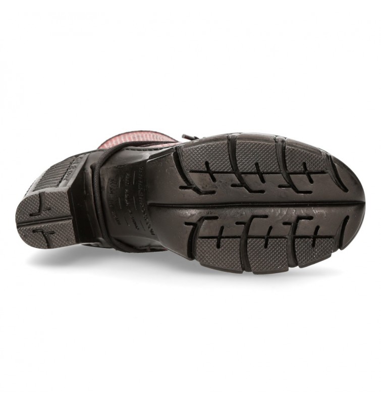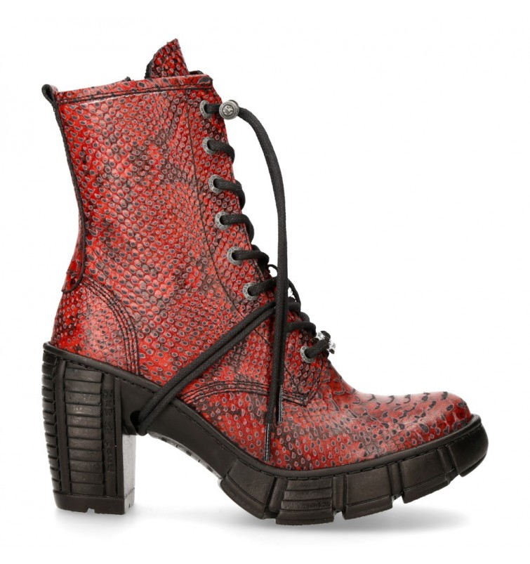 Botines de la colección Trcasco de New Rock. Fabricados en cuero, contienen una cremallera lateral oculta y un cordón ajustable que proporcionan facilidad para ponérselas y quitárselas, y gran adaptabilidad al pie. Tienen pequeña plataforma en la suela y el tacón bloque de acero característico de New Rock.