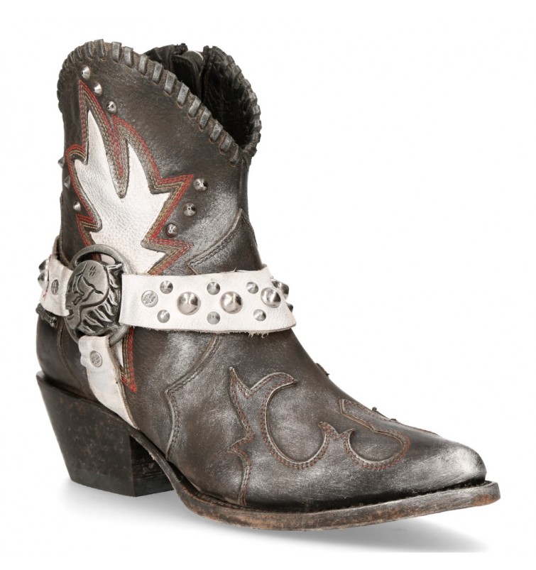 Botines de la colección Dallas de New Rock. Fabricados en cuero y piel de serpiente, son elásticos para proporcionar facilidad al ponerselas y quitarselas y gran adaptabilidad al pie. Estos botines tienen tacón de acero característico de New Rock.