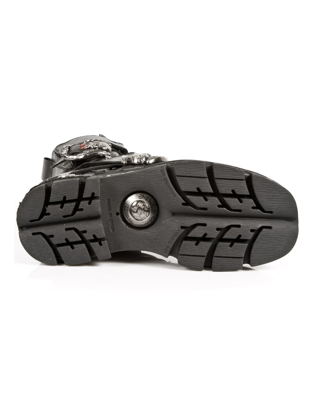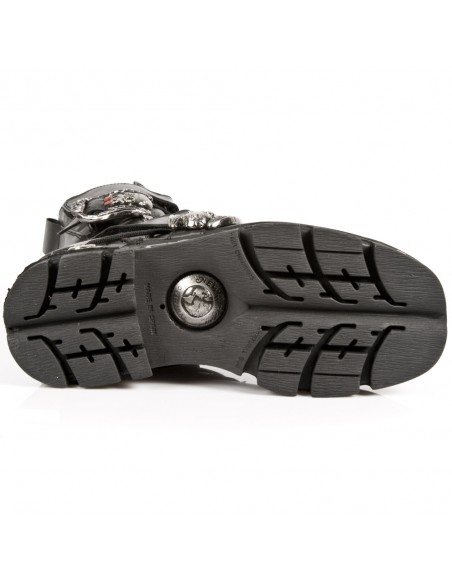Botas de tacón y plataforma de media caña. Unisex de la marca New Rock. Pertenecen a la colección Reactor. Se ajustan mediante cordones, 2 velcros y 2 hebillas decoradas con vampiros. Tienen detalles metalicos en la suela Reactor en la parte trasera y frontal.