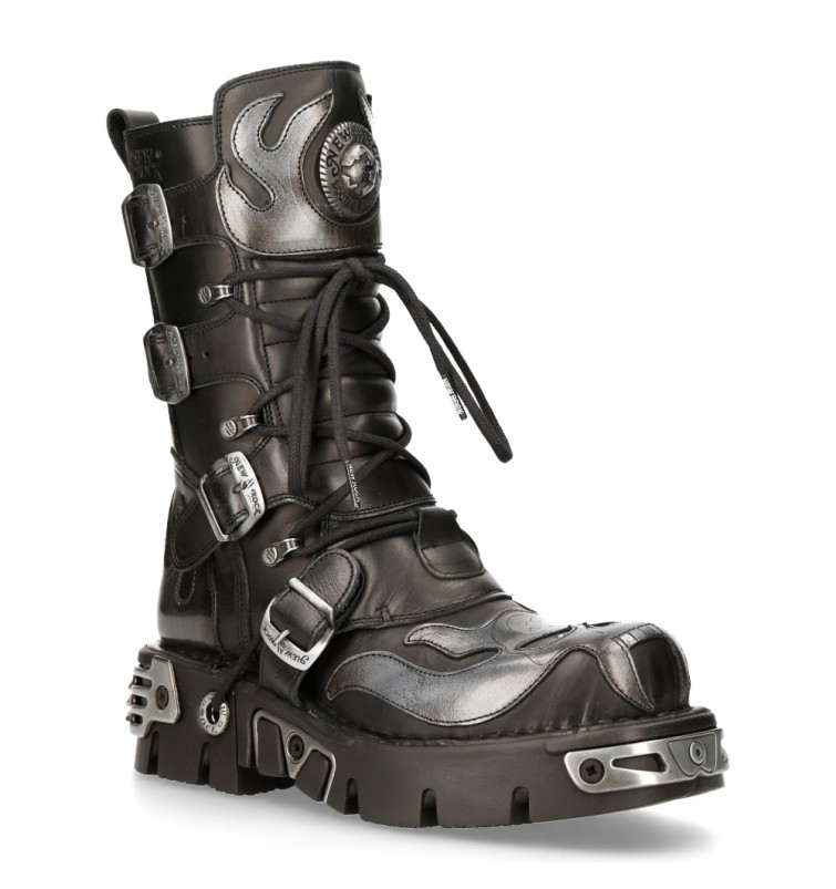Botas de tacón con Plataforma caña media. Unisex de la marca New Rock. Pertenecen a la colección Metallic. Fabricadas con suela Reactor. Están decoradas con llamas en distintos colores. Para una mayor sujeción cuentan con 4 hebillas, cordones y cremalleras.