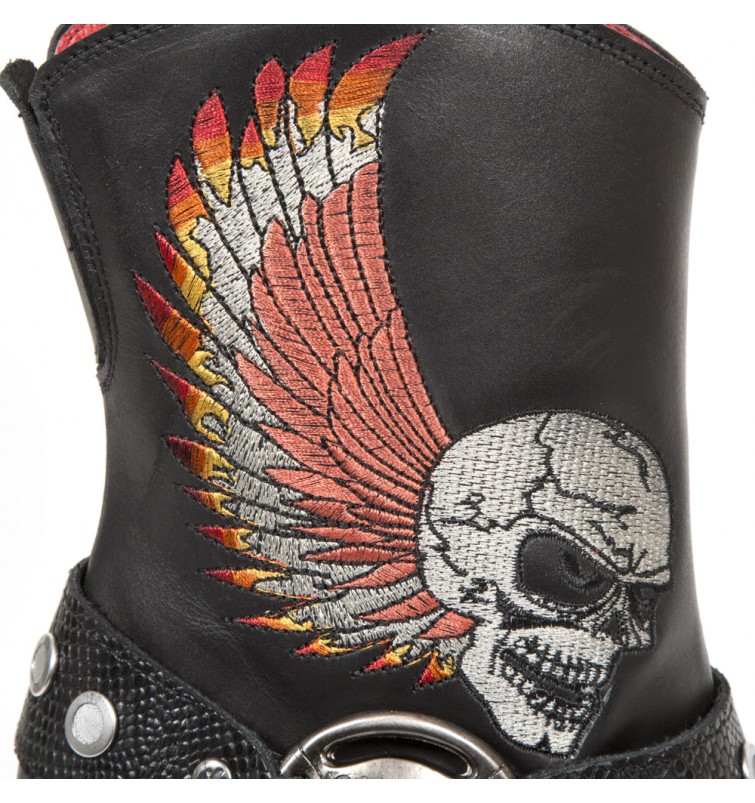 Botas de la colección Bull de New Rock. Fabricados en cuero, son elásticas para proporcionar facilidad al ponerselas y quitarselas y gran adaptabilidad al pie. Estas botas de punta tienen tacón de acero característico de New Rock. Están diseñadas con una calavera y alas de fuego.